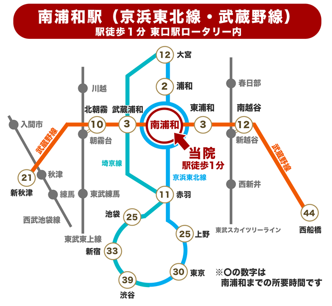 ● JR京浜東北線・JR武蔵野線「南浦和」駅下車 東口から徒歩1分